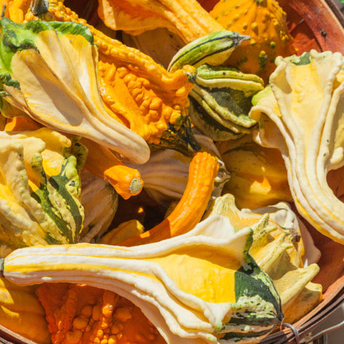 Member of the squash family. Produces an assortment of small gourds of various shapes, sizes, and colors